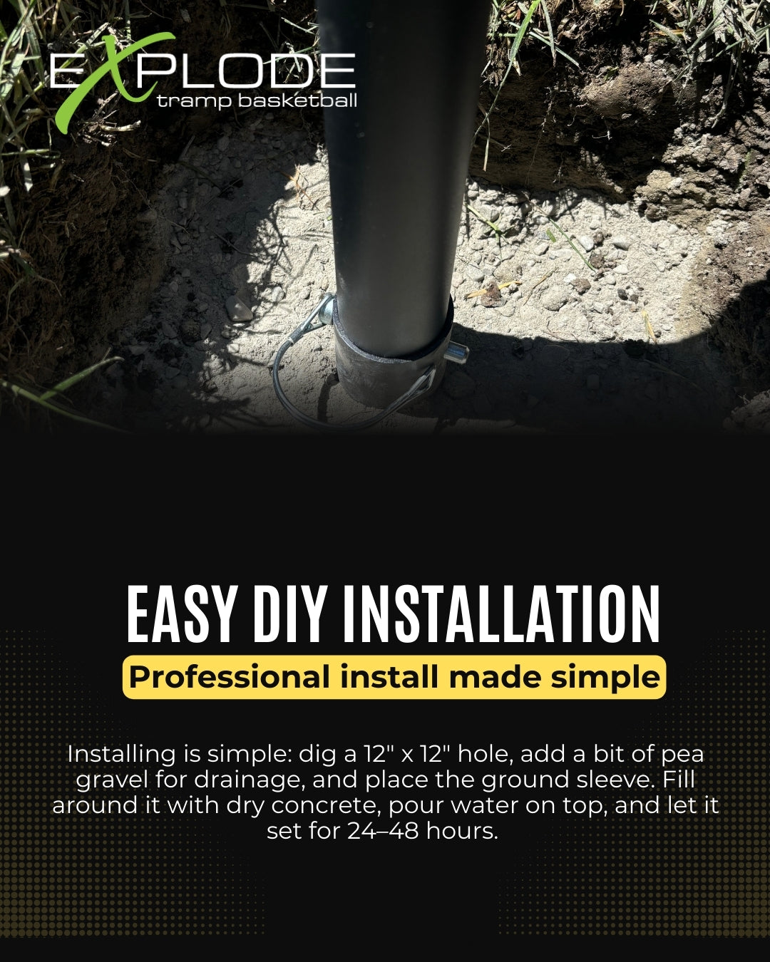 Designed for durability and easy installation. The EXPLODE basketball hoop comes with a detachable ground sleeve that securely anchors into the ground with a small bag of concrete. This sturdy setup ensures long-lasting stability, while the hoop itself can be easily detached from the sleeve for convenient storage or transport. Perfect for a reliable, hassle-free setup that stands up to dunking and heavy play!