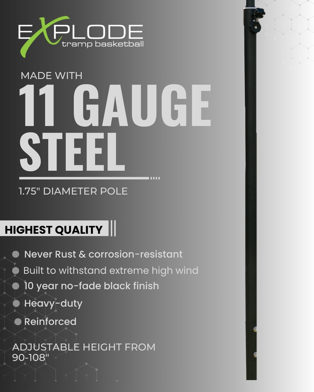 - Durable 11-gauge steel pole with an adjustable height range from 90" to 108"